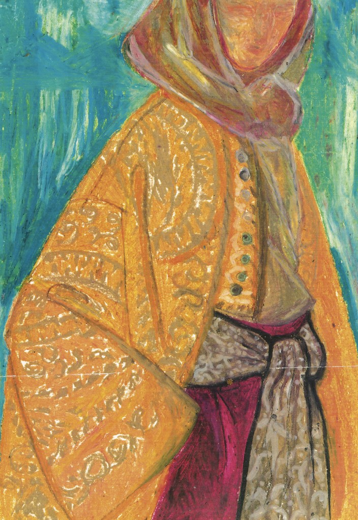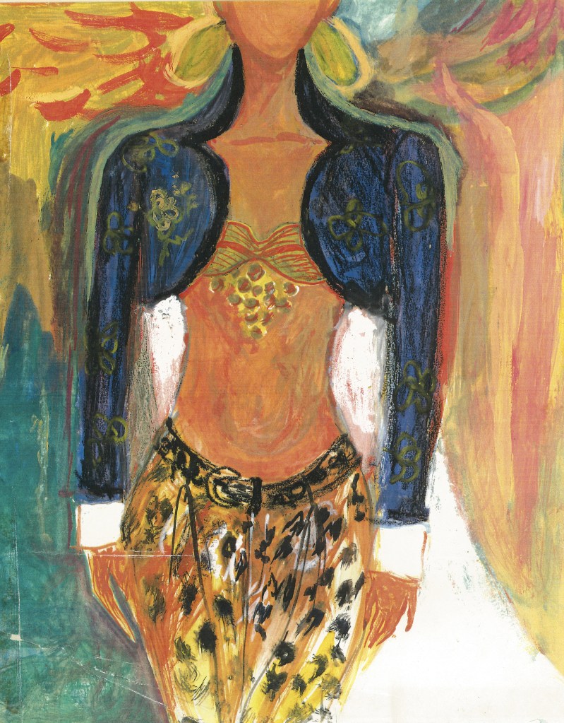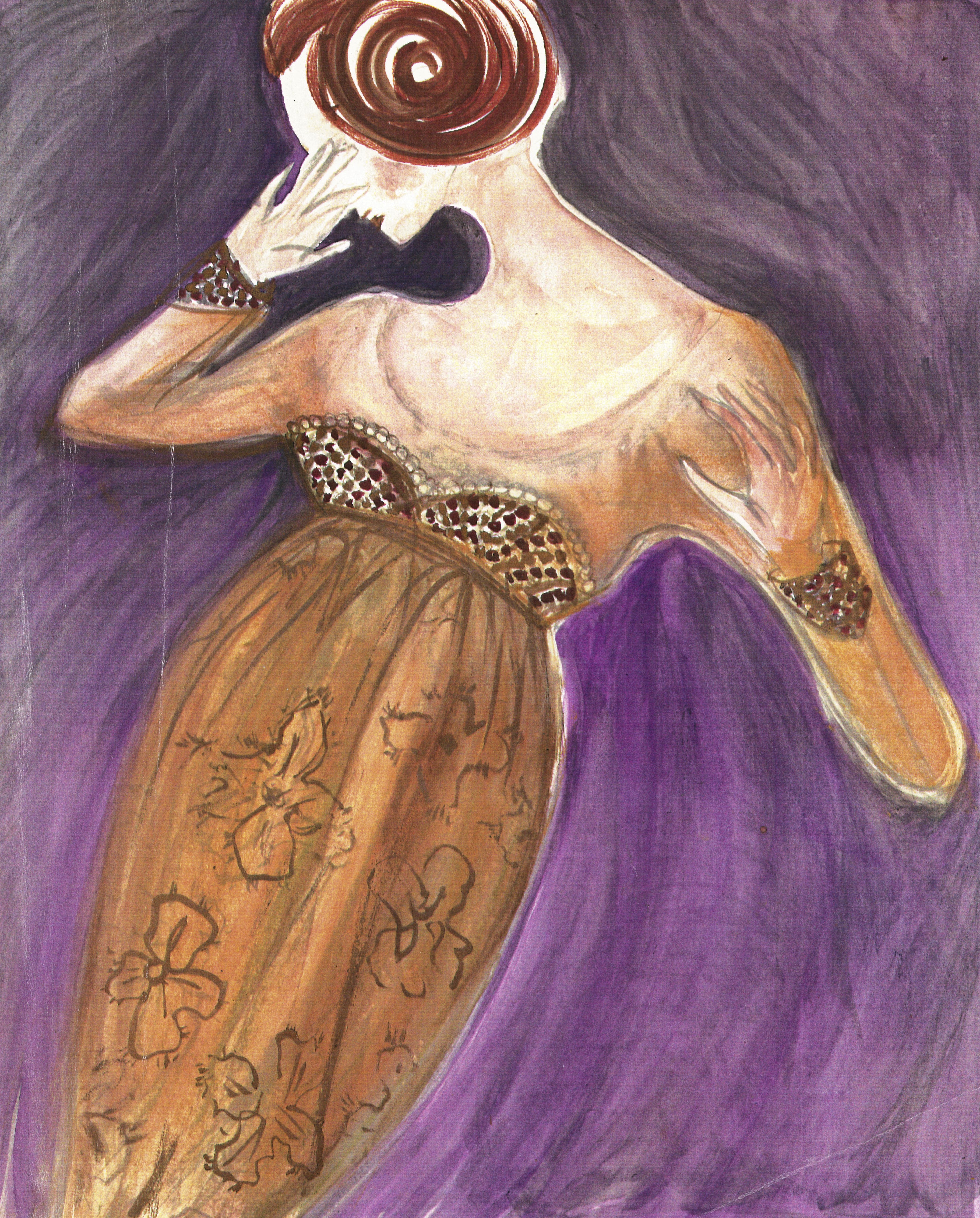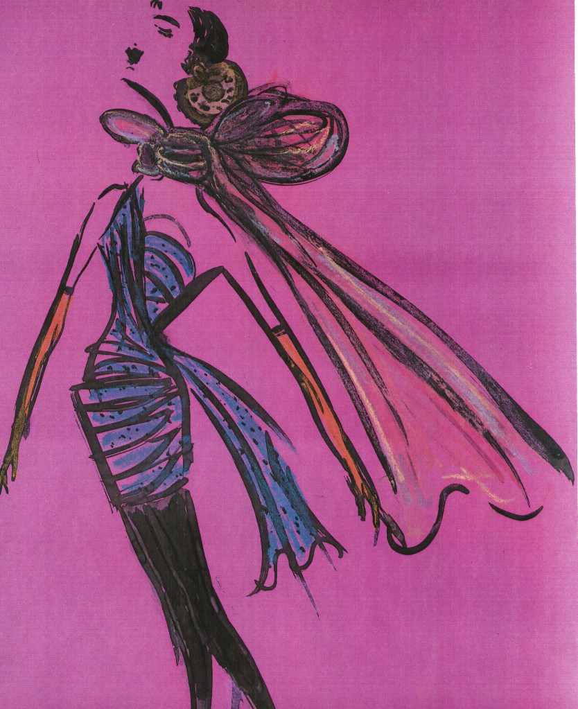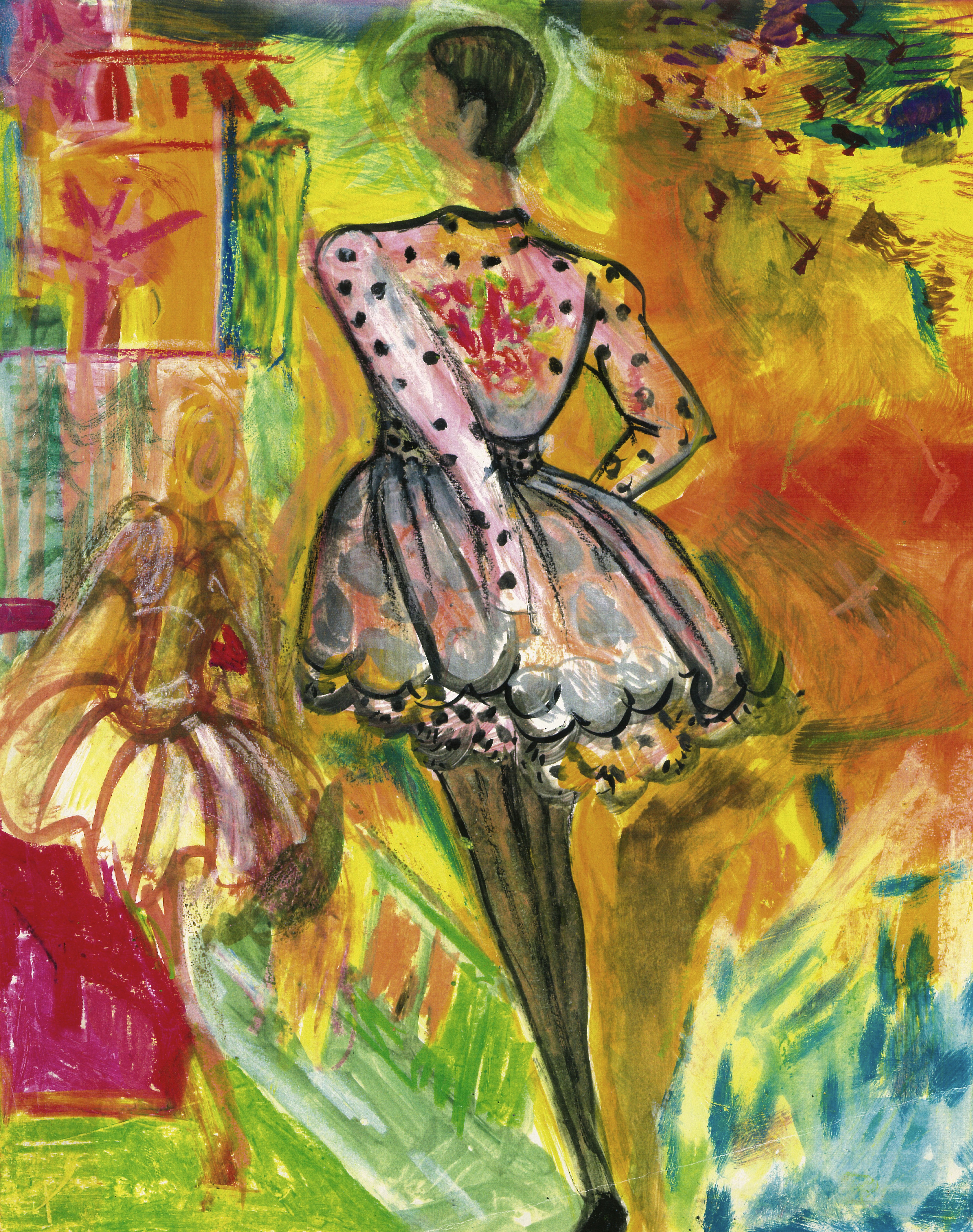 Kelley’s love of color, pattern and form inspired a passion that ran parallel to her design career—fashion illustration. As an illustrator she was inspired early on by René Grau, Carl Erickson, Merle Basset and René Bouché. The painters Cezanne, Van Gogh, Gaugin, Matisse and Toulouse-Lautrec also had a profound influence on the development of her style. She worked from runway and other editorial photos, producing works on paper primarily using ink, gouache and pastel.
